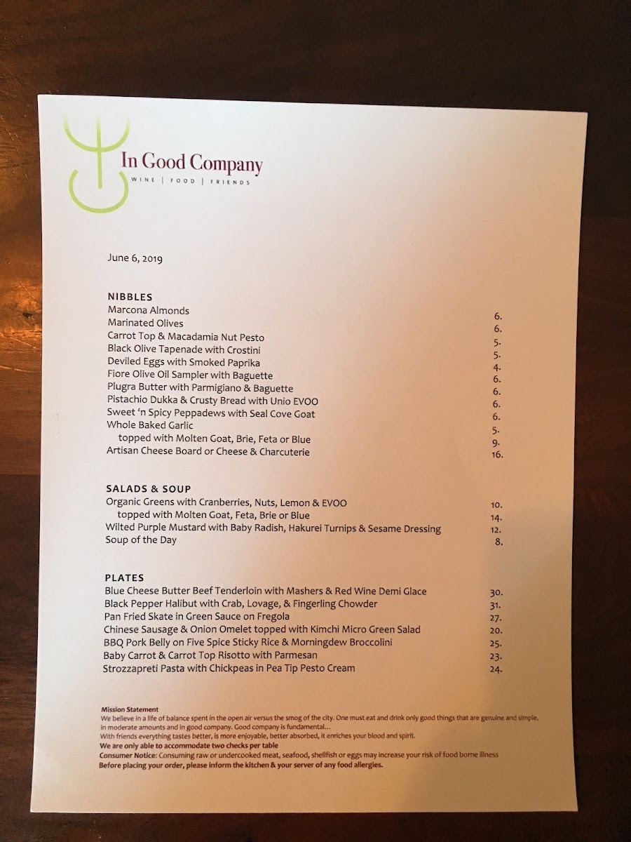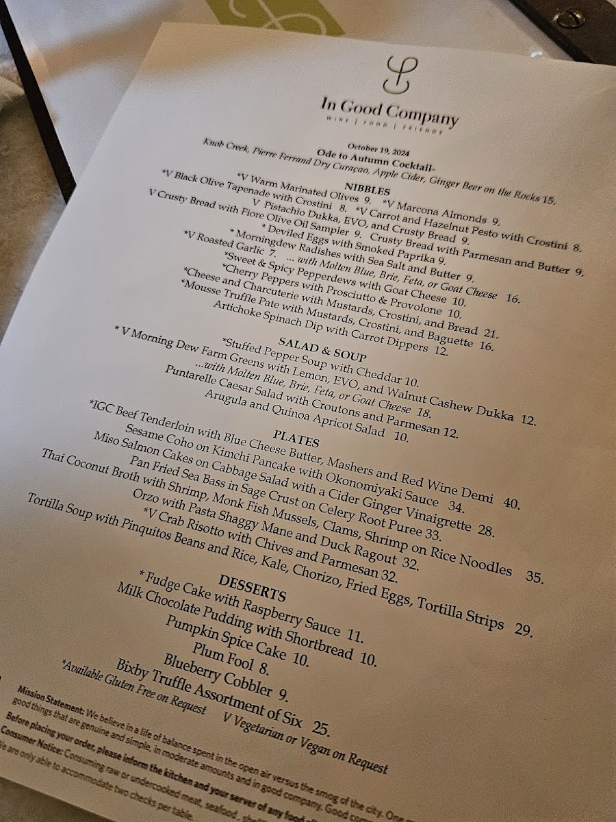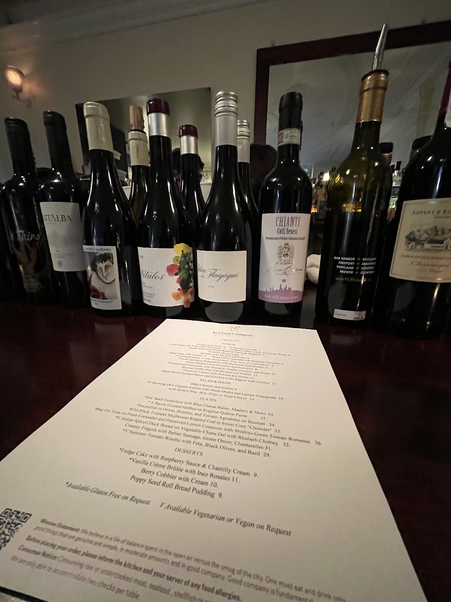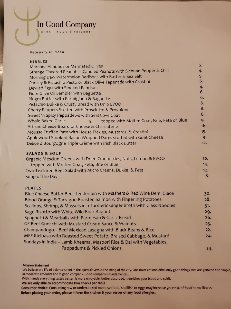 From a reviewer’s perspective, the menu at In Good Company at 415 Main St, Rockland, ME 04841 feels like a thoughtful closing statement on what the restaurant does best: confident, ingredient-driven cooking with creative flair. The Nibbles set the tone with simple yet elegant starters such as Marcona Almonds, Marinated Olives, Carrot Top & Macadamia Nut Pesto, Black Olive Tapenade With Crostini, and Deviled Eggs With Smoked Paprika, all designed to invite sharing and spark the appetite. Moving into Salads & Soup, dishes like Wilted Purple Mustard With Baby Radish, Hakurei Turnips & Sesame Dressing showcase a clear respect for freshness and balance, while Soup Of The Day adds a comforting, ever-changing element that reflects seasonality. The heart of the menu lies in the Plates, where bold flavors and careful technique come together: the richness of Blue Cheese Butter Beef Tenderloin With Mashers & Red Wine Demi Glace contrasts beautifully with the coastal elegance of Black Pepper Halibut With Crab, Lovage, & Fingerling Chowder. More adventurous offerings such as Pan Fried Skate In Green Sauce On Fregola and Chinese Sausage & Onion Omelet Topped With Kimchi Micro Green Salad highlight the kitchen’s willingness to blend traditions, while Bbq Pork Belly On Five Spice Sticky Rice & Morningdew Broccolini delivers depth, spice, and satisfaction. Taken as a whole, the menu feels cohesive and complete-an experience that balances comfort and creativity, leaving a lasting impression and neatly summarizing why dining at In Good Company is both memorable and rewarding.